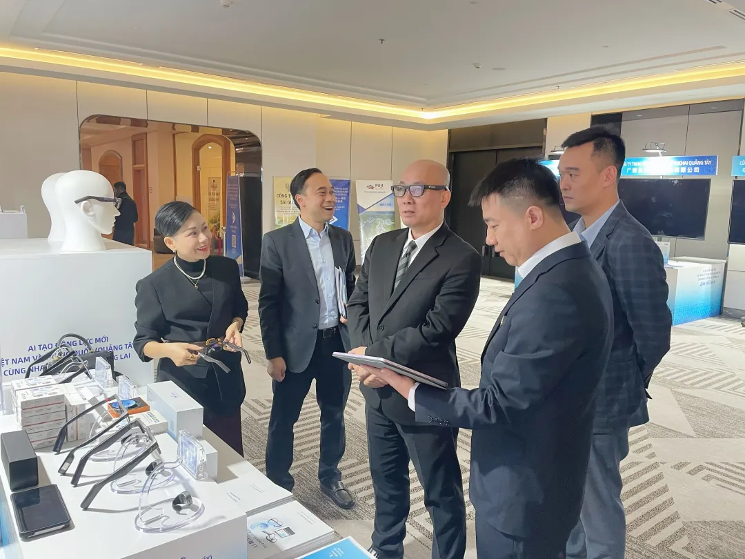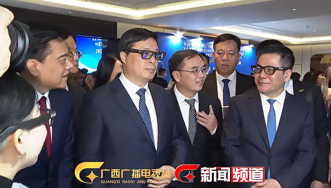 活动特设 “AI赋能,共创未来” 展廊,集中展现广西智造的硬核实力,迈越科技携AI系列眼镜、AI翻译卡等前沿产品参展。期间,韦韬与阮鸿延巡展至迈越科技展台,参观了解AI翻译提词眼镜的技术原理与应用场景,对其破解跨境沟通障碍、赋能区域合作的创新价值给予高度认可。