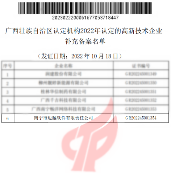 近日,全国高新技术企业认定管理工作领导小组办公室发布《关于对广西壮族自治区认定机构2022年认定的高新技术企业进行补充备案的公告》,南宁市迈越软件有限责任公司顺利通过2022年度高新技术企业复评。