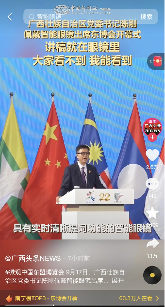 9月17日上午,第二十二届中国—东盟博览会在南宁国际会展中心隆重开幕,本届展会聚焦“数智赋能发展,创新引领未来——以中国—东盟自贸区3.0版新机遇助建命运共同体”主题,多项科技创新成果集中亮相。其中,广西壮族自治区党委书记陈刚在开幕式上重要发言环节的“无稿演讲”场景引发广泛关注,其佩戴的广西企业生产智能眼镜背后,核心技术支撑源自迈越科技股份有限公司。