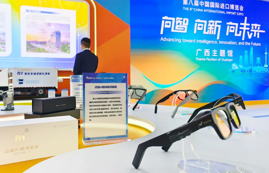 11月5日,第八届中国国际进口博览会在上海开幕。自治区商务厅携48家企业和超百款“广西好物”参展,自治区党委常委、自治区副主席卢新宁巡视广西综合形象馆,会见参展嘉宾及企业代表。迈越科技作为从广西本土成长起来的国家高新技术企业,携AI眼镜系列产品惊艳亮相,一展人工智能领域的广西风采。