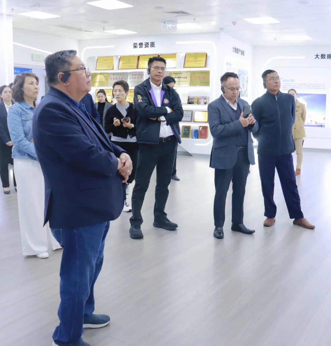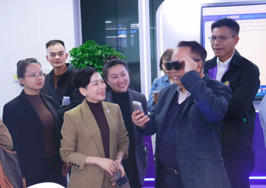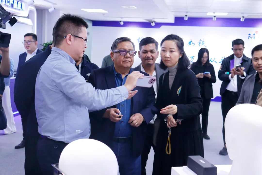 11月3日,来桂出席2025“东盟伙伴”媒体合作周系列活动的国际嘉宾——柬埔寨新闻部国务秘书肯・顾纳瓦,缅甸宣传部副部长耶丁,泰国媒体发展基金会首席执行官塔纳功·习素塞等东盟国家政要及媒体界代表参访迈越科技,实地考察广西人工智能穿戴设备研发成果,共探人工智能技术共建共享新机遇。