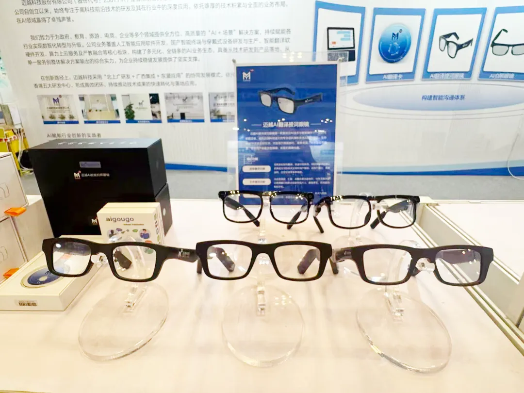 在广西展区的AI教育应用板块,迈越科技带来的AI翻译提词眼镜、翻译卡等AI翻译产品成为现场关注的焦点。这些具有智能翻译、实时提词、拍照识别等功能的智能硬件设备,与专为教育场景设计的AI智能体应用平台、AI教学质量评价分析平台等AI软件产品,共同展示了迈越AI技术在智慧课堂、跨境教育中的赋能场景,让参观者们亲身感受到“AI+教育”带来的便捷与高效。