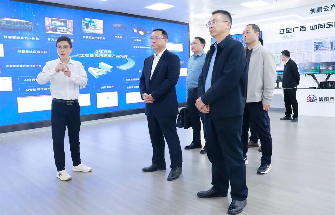 甘毅一行参观了迈越科技展厅,深入考察迈越科技在人工智能、算力领域、国产化信创产品的部署应用。黄有章针对算力上云解决方案作了详细介绍,并分享了迈越科技在算力建设上的核心优势。他还提到,公司自有产线——创鹏云智造(广西)生产基地当前已在南宁市落成启用,正在积极助力区域数字产业转型的升级。