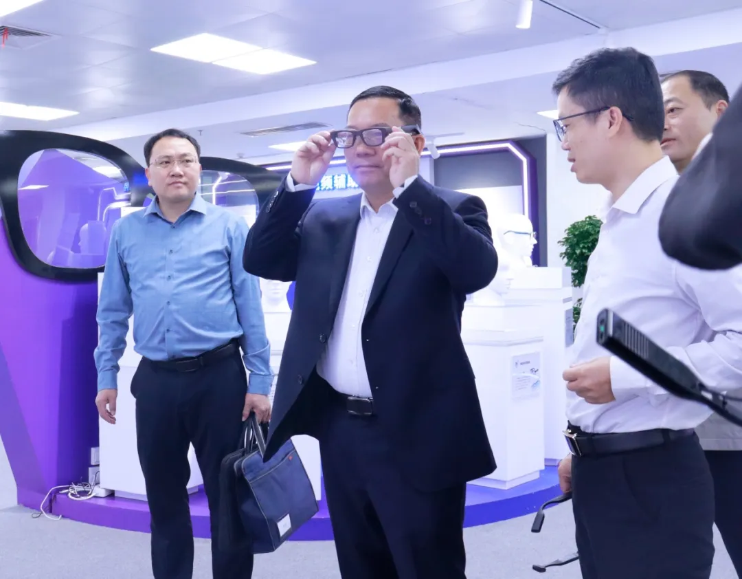 考察团在AI展厅体验了最新的AI眼镜,对其新开发的实用性功能及轻量化的设计表示赞赏。黄有章表示,迈越科技的产品注重场景化应用,并指出未来可以结合河池学院的学科优势与本地矿业资源,拓展具体解决方案。