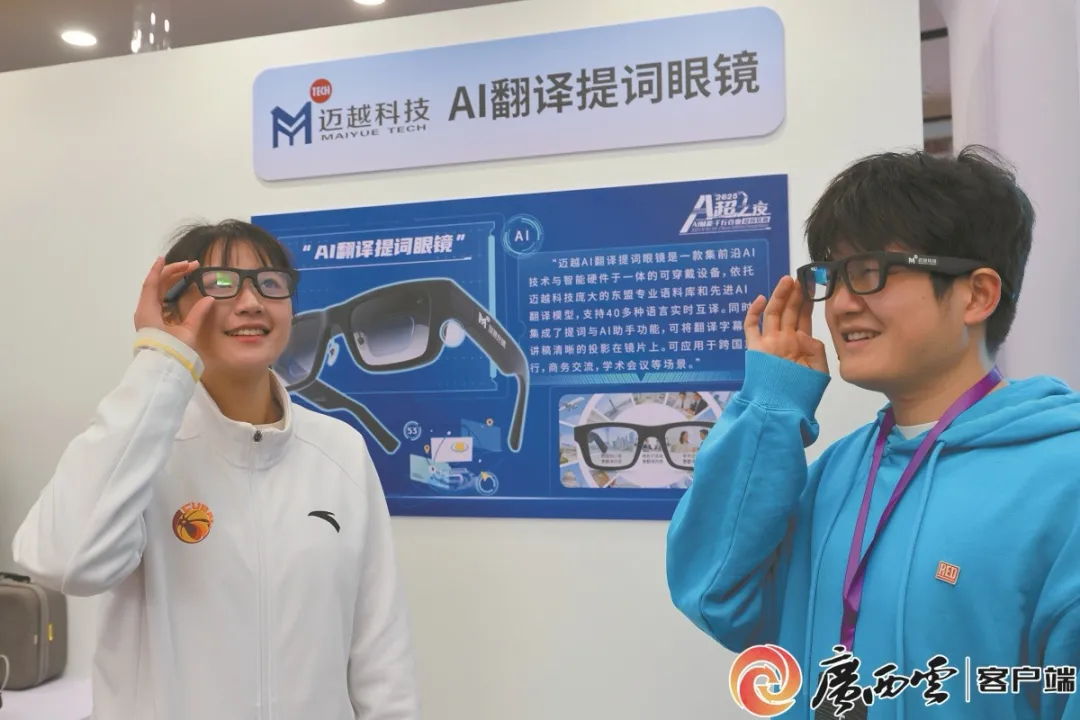 在“A超之夜”主题展区,迈越科技展示的AI翻译提词眼镜、智能拍照眼镜等系列智能穿戴式产品,是其深耕AI技术研发与场景落地的重要成果,可应用于商贸、文旅、政务等多个领域,能实现翻译题词、摄影娱乐、智能交互等多元功能,充分展现了人工智能技术与实体经济深度融合的无限可能,是实践 “北上广研发 + 广西集成 + 东盟应用” 创新路径的生动展现。